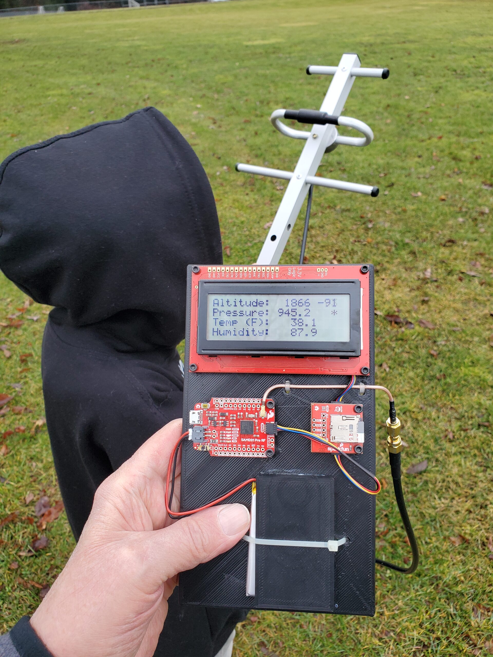 The hand held receiver receives all of the data from the balloon which is miles high in the sky and displays it on an OLED display screen. You can see the altitude as it increases and the position of the balloon over the ground as it floats higher and higher and further and further away. It consists of two small electronics boards, an OLED display, a battery and an antenna. The boards are a microprocessor board with an integrated receiver and a board with an SD card that saves all of the data from the balloon. The OLED display shows all of the incoming data in real time. The antenna is a directional antenna which is pointed in the direction of the balloon to receive the transmissions.